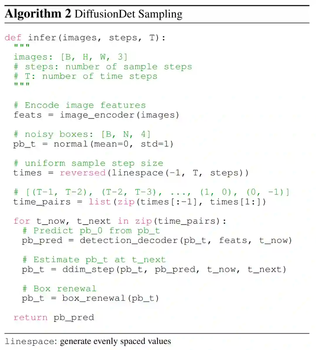 DiffusionDet 的推理过程是从噪声到目标框的去噪采样过程。从在高斯分布中采样的框开始,该模型逐步细化其预测,具体如下算法 2 所示。