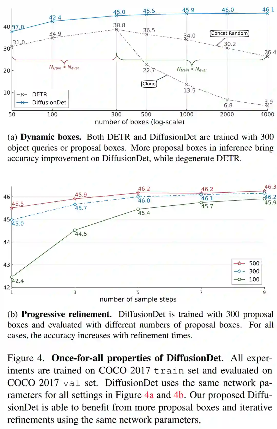 一次解决(Once-for-all)。得益于随机框设计,研究者可以使用任意数量的随机框和采样步骤来评估 DiffusionDet。作为比较,以往的方法在训练和评估期间依赖于相同数量的处理框,并且检测解码器在前向传递中仅使用一次。