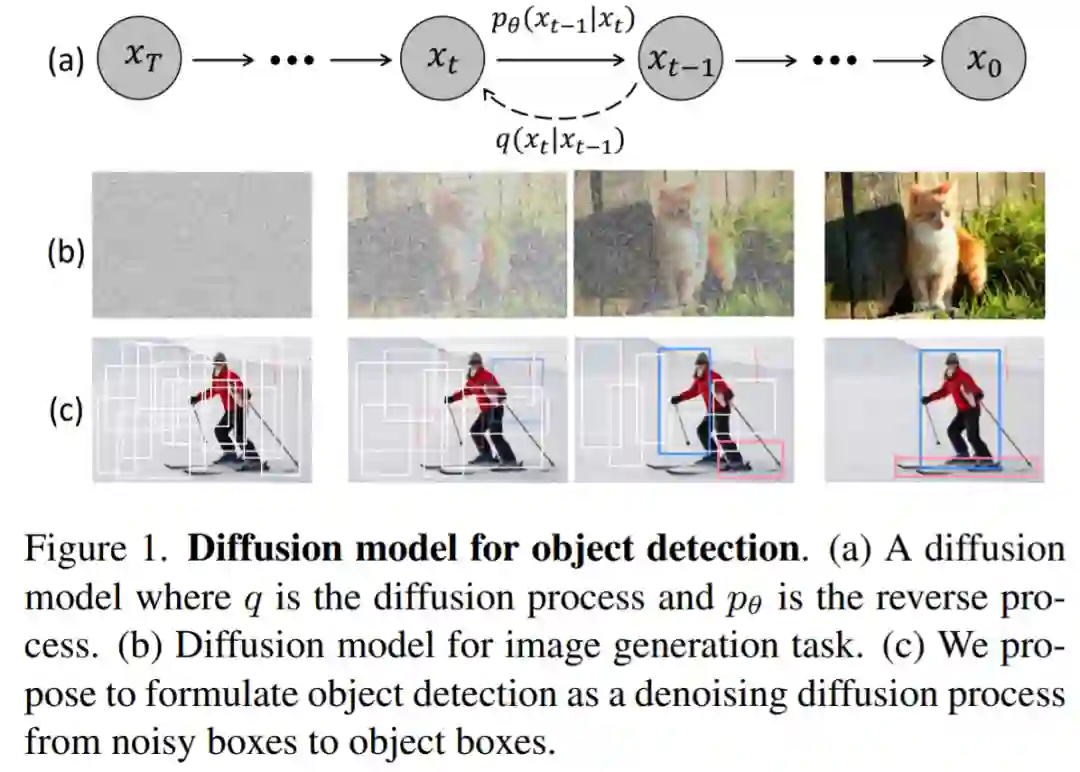 如下图 1 所示,该研究认为 noise-to-box 范式类似于去噪扩散模型中的 noise-to-image 过程,后者是一类基于似然的模型,通过学习到的去噪模型逐步去除图像中的噪声来生成图像。