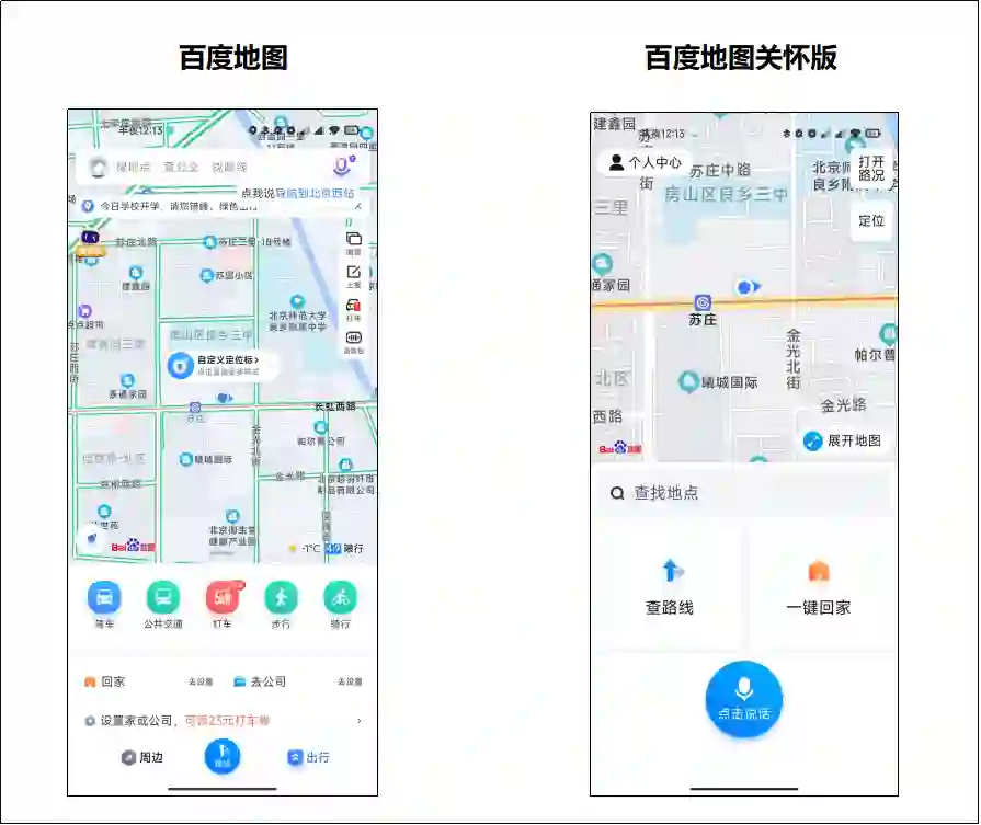 在适老化的产品改造中,不能仅是简单粗暴地把字号调大,更需要真正地站在用户的视角去思考。百度地图关怀版中将首页复杂的功能和入口进行了精简,仅留下最核心的功能和入口,缩短了操作路径。