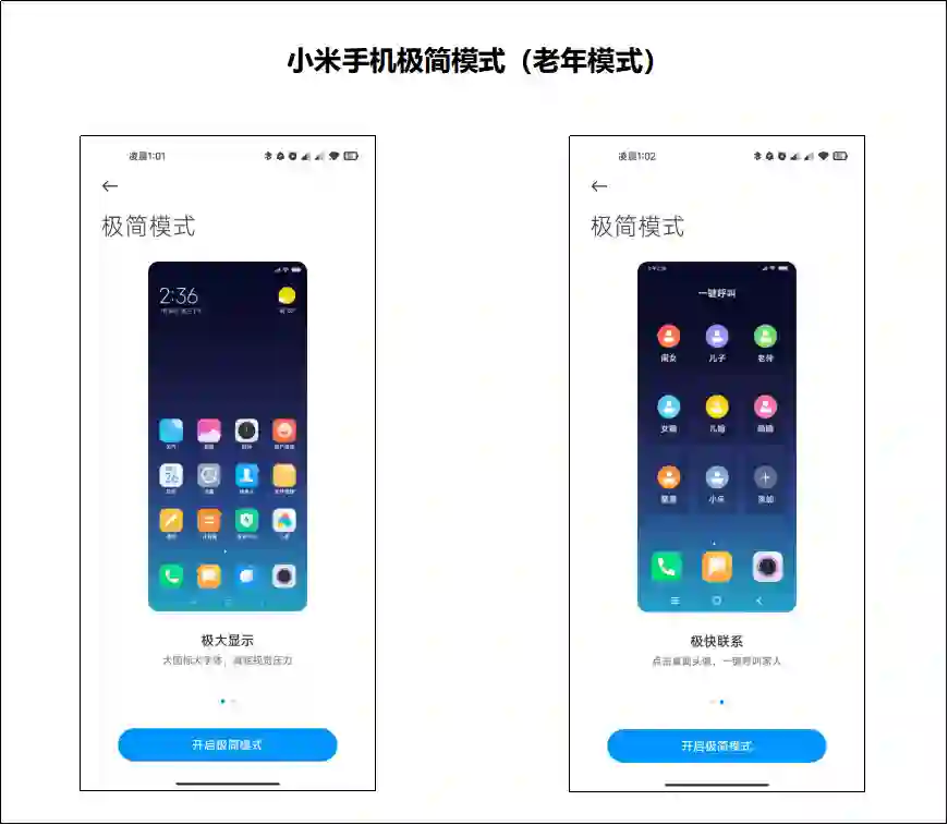 知名品牌针对中老年人推出的定制化手机品类还比较少,多数也仅是停留在字号的变化上。小米手机目前支持将桌面设置成极简模式(老年模式),支持极大显示和极速联系两个便捷功能。期待未来有更多针对硬件操作本身方面的适老化探索。