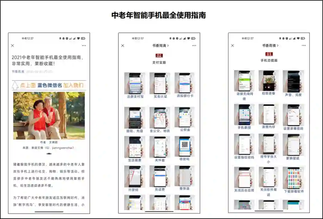 这其中,还需要社会各界的通力配合,包括家人的陪伴和辅助,村镇定期举办中老年手机使用培训讲座等。