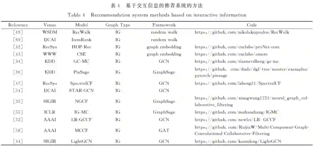 基于交互信息的推荐系统通常仅考虑用户与物品之间的 交互关系来实现对用户的兴趣偏好建模,其基于这样一个假 设,即用户对物品的喜好不随时间发生改变,从而为目标用户 提供反映该用户长期兴趣的静态物品推荐列表.基于交互信 息的推荐系统利用图学习的方法,对用户的交互二部图以及 用户与物品的节点属性进行学习,以捕获用户和物品之间复 杂的、高阶的和间接的交互关系,实现对用户与物品邻接矩阵 的补全,利用补全的邻接矩阵来评估 O+ 中用户u 对没有交 互的物品i+ 感兴趣的概率或者评分.基于图学习的方法使 信息在用户与物品交互图上的节点之间广泛传播,以丰富交 互较少的用户和物品的信息,能够缓解数据稀疏性和冷启动 问题.然而在交互图上,用户或物品之间可能不存在直接连 接,消息需要通过多跳邻居节点进行传播.因此,基于图学习 方法在推荐领域如何高效地在用户或物品之间传播信息成为 一个重大挑战.为充分发挥基于图学习方法在用户与物品交 互图上的模型性能,本文将消息传播问题主要概括为: