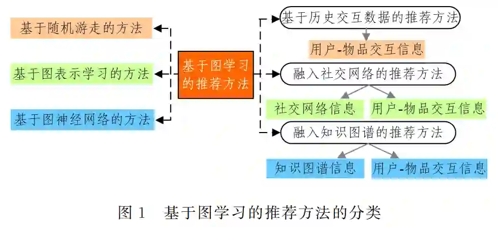 推荐系统中的大部分数据本质上都可被视为图结构数 据.例如,用户对物品的交互行为(点击、浏览、购买等),从图 结构方面考虑,用户一旦点击或购买物品,就与这些物品相关 联.但绝大多数深度学习任务都是针对1D,2D或3D 的欧氏 结构化数据(如声音信号、图像和视频等)进行研究.推荐系 统中的非欧氏结构化数据(图结构数据)的节点的邻域并不一 致,部分节点的邻居节点多,部分节点的邻居节点少.非欧氏 结构化数据的复杂性使得传统的深度学习无法有效地建模图 结构数据[20].随着图学习(GraphLearning,GL)方法,特别 是图学习中的图神经网络(GraphNeuralNetworks,GNN)的 提出,其在复杂关系提取和链路预测等许多图任务中取得了 巨大成功[21G27],引起了学术界和工业界研究人员的关注.由 于推荐系统的大部分数据具有图结构的特性,将图学习方法 应用到推荐领域是一种很自然的做法.因此,图学习方法已 逐渐成为推荐领域内一种被广泛研究的新兴推荐范式,即基 于图学习的推荐系统[28G31].当用户与物品的交互信息和用 户与物品相关联的辅助信息被构建成图结构形式,再结合以 随机游走、图表示学习和图神经网络为主要代表的图学习方 法,即可捕获、学习和模拟用户与物品之间高阶的、复杂的关 系,更加有效地学习用户的长期兴趣偏好和物品的特征属性, 以提升推荐系统的推荐性能[32G36].因此,对基于图学习的推 荐方法进行系统性的总结与回顾,可以使研究者们更好地把 握这一新兴领域的研究现状和挑战,促进图学习方法在推荐 领域的发展.