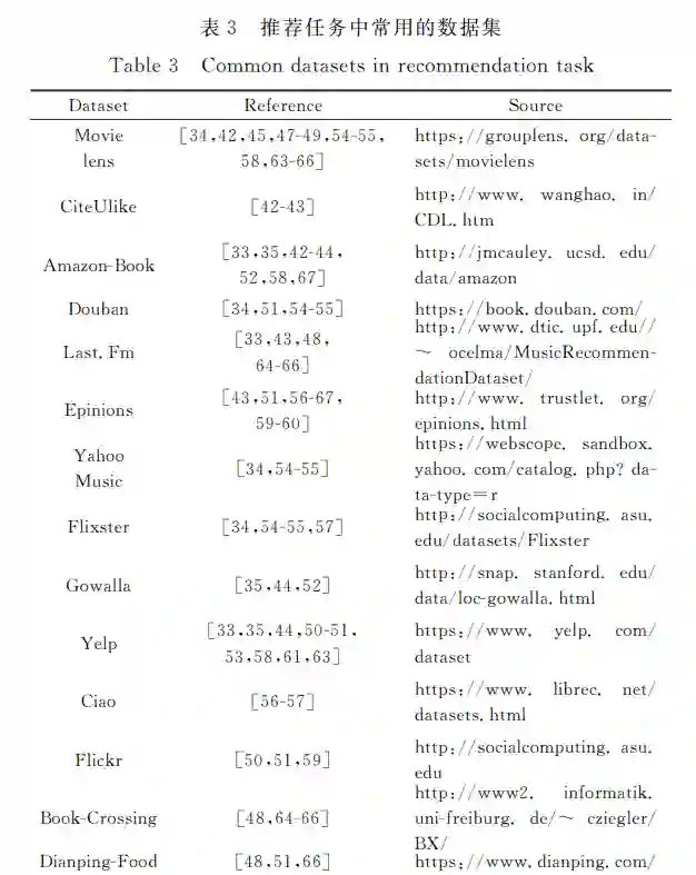 由于图学习技术在推荐领域中的广泛运用,一部分研究 学者已经对基于图结构数据的推荐系统进行了回顾和总结. Laknath [29]从全局排名方法、重启随机游走到吸收随机游走3 个方面对不同推荐任务中的随机游走方法进行了详细的分析 与总结.Gao等[30]主要从推荐系统的冷启动、可扩展性、个 性化以及动态性的推荐问题出发,对基于知识图 谱(KnowG ledgeGraph,KG)推荐任务上的图神经网络方法进行了回顾 和总结.Guo等[28]将知识图谱任务上的推荐方法划分为嵌 入方法、路径方法以及未统一定义方法,然后分别对各分类中 的推荐方法进行了详细的分析与总结.Wu等[31]从图神经网 络角度对传统推荐、社交推荐和知识图谱推荐进行了总结. 然而,上述综述工作存在不足之处,Laknath [29]和 Wu等[31]的 综述工作仅对单一的推荐方法(前者是随机游走方法,后者是 图神经网络方法)进行了回顾,Laknath [29]的综述工作时间较 早,并没有总结近几年的相关推荐任务和方法.Gao等[30]和 Guo等[28]的综述工作仅对单一的推荐场景(知识图谱)进行 了总结.然而单一的推荐方法和推荐场景不能使研究学者快 速且全面地了解基于图结构的推荐场景的研究现状和挑战. 针对上述工作的不足,本文首先总结了推荐任务中常用的数 据集和评价指标,以方便研究者快速开展对推荐系统的研究; 其次,根据运用的推荐数据类型将推荐运用场景分成两组: 基于交互信息的推荐系统(仅利用用户与物品的交互数据)和辅 助信息增强的推荐系统(融入与用户和物品相关联的社交信 息以及知识图谱信息等信息).其中,辅助信息增强的推荐系 统主要从用户社交信息和物品知识图谱两个方面对用户和物 品相关联的辅助信息进行详细分析,从而对辅助信息增强的 推荐系统进行回顾与总结.针对不同的推荐运用场景,分别 对随机游走、图表示学习和图神经网络这3种图学习方法进 行总结,分析了不同的图学习方法在不同推荐场景下的难点 和研究现状.最后,本文总结了图学习方法在推荐领域的未 来研究方向,使研究者可以更加清晰地了解图学习在推荐领 域中的挑战和发展趋势.基于图学习的推荐方法的分类如 图1所示.