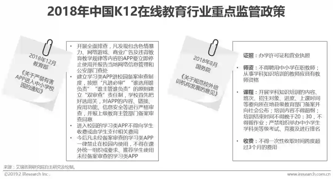 随着K12在线教育的快速发展与激烈竞争,2018年进校类APP频频爆出内含色情暴力、网络游戏、商业广告等问题。K12校内教育由教育部直接管辖,在线教育开始受监管之后,进校类APP首当其冲。2018年12月教育部发布《关于严禁有害APP进入中小学校园的通知》前后,进校类APP在全国范围受到了监测核查,部分违规APP被责令停止运营、责令关闭问题板块、给予罚款或下架。2018年K12线下课外辅导机构也遭遇强监管,根据“按照线下培训机构管理政策,同步规范线上教育培训机构”的原则,2019年K12在线学科辅导也将在证照、师资、课程细则、收费等方面受到排查。