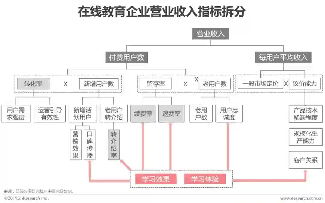 一个可行的商业模式需要满足营业收入大于营业成本的基本条件。营业收入可以简单由付费用户数和每用户平均收入(ARPU)相乘得来,经过一层层拆解之后,我们可以发现支撑职业收入上涨的几个核心指标是用户转化率、续费率、转介绍率。而支撑这些核心指标的更底层指标是这个企业的学习效果和学习体验。