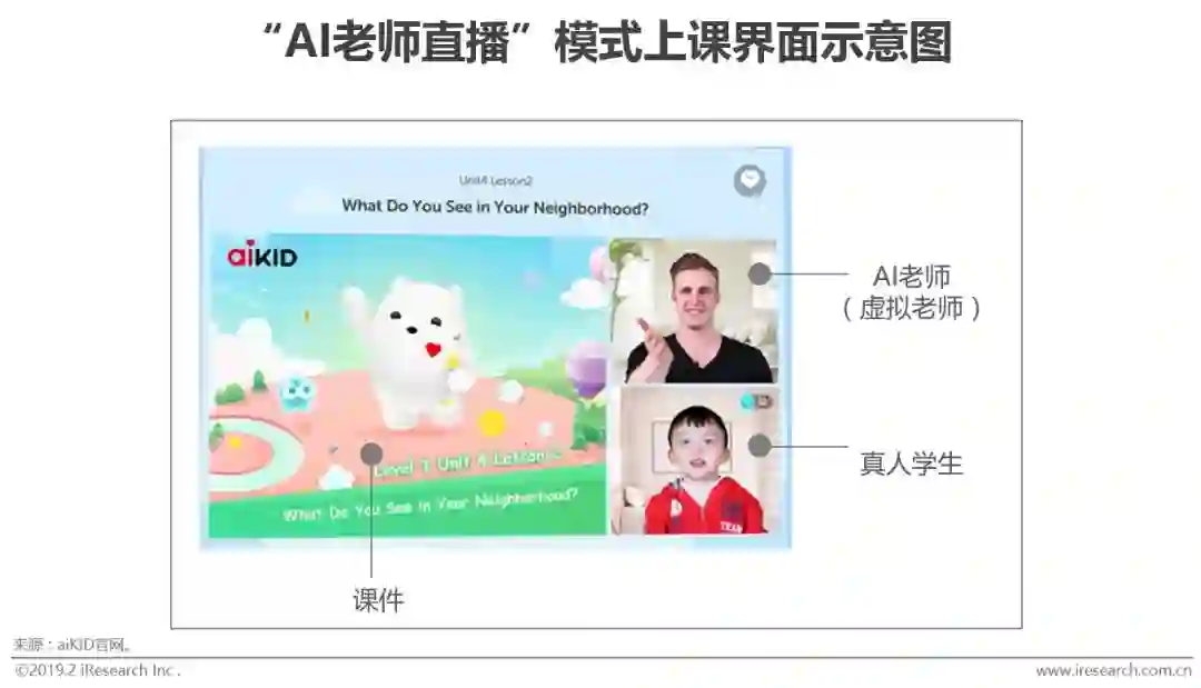 在直播+AI相关的尝试中,企业间分出两大派思路,一派是以真人老师为主、AI功能为辅,真人老师负责授课核心环节,AI辅助真人老师进行课前的师生匹配和课件推送、课中的情绪识别、课后的作业批改,这种方式的直接成本来自于老师课酬,因此课程售价较高,一节1对1课程的售价一般在100-300元。另外一派是以AI老师(虚拟老师)为主、真人老师为辅,两位老师角色互换,这种方式除前期研发费用较高外,每节课的直接成本几乎可以忽略,因此课程售价较高,一节课仅需10-20元。目前,各大在线直播领域的头部机构纷纷探索第一种方式,如VIPKID、掌门1对1等,而初创品牌更倾向于第二种方式,如今日头条旗下的aiKID、叮咚课堂等。