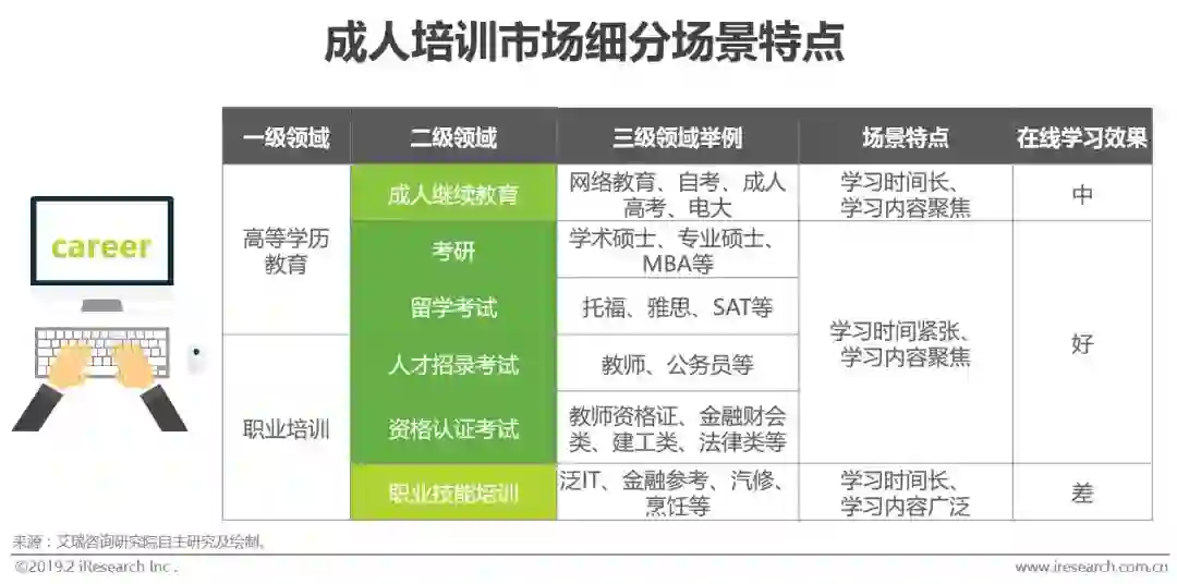 成人市场是在线教育渗透最早的一个领域,主要包括高等学历教育和职业培训(含成人语言培训),这两个领域下又可细分出很多三级领域。其中,考研、留学语言考试等高等学历考试培训,教师、公务员等人才招录考试培训,教师资格证、CPA证等资格认证考试培训,这3个领域的在线学习效果最佳,主要原因是这些场景具有“结束时间明确、学习内容有限“的特点,用户学习时间紧张、学习内容又聚焦于考点,因此学习动力最强、难度最小。而成人培训领域的其他细分领域就因为不具备这些特点,所以在线化过程中存在相对更多的完课率低、学习体验差等问题,这些细分领域的培训机构也需要在用户激励方面投入更多的人力和财力。