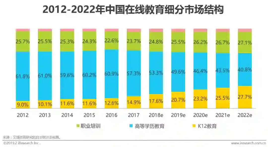 高等学历和职业类占80%市场,K12占比近六年几乎翻番