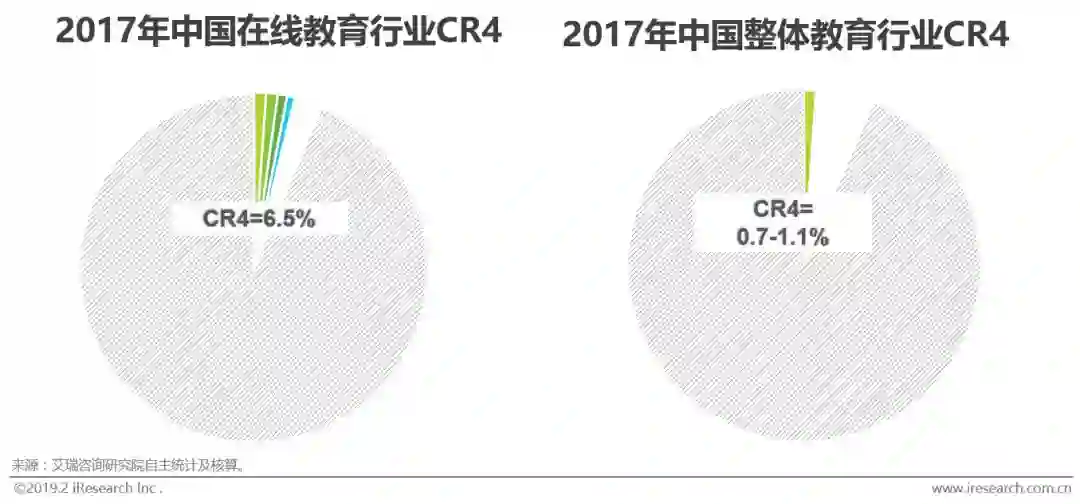艾瑞数据显示,2017年中国在线教育市场规模为2002.6亿元,行业内年营收排名前4企业的营收总和达131亿元,TOP4共占据了6.5%的市场份额,即CR4=6.5%。CR4是行业前四名份额集中度指标,反映的是一个行业的竞争和垄断程度。