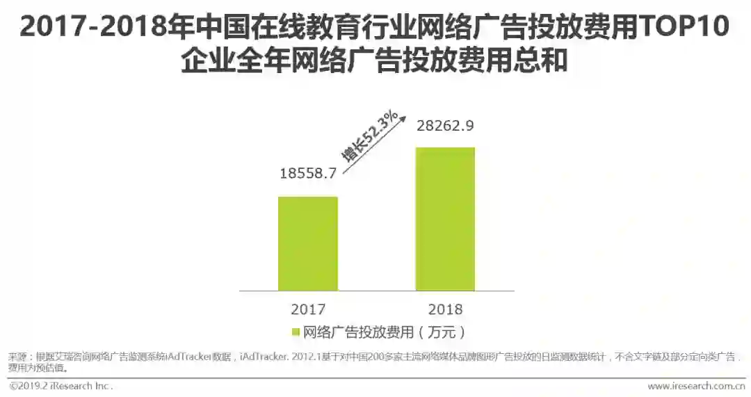 艾瑞数据显示,2017年中国在线教育行业网络广告投放费用TOP10企业全年网络广告投放费用总和为18558.7万元,2018年这一费用上升到了28262.9万元,同比增长52.3%。