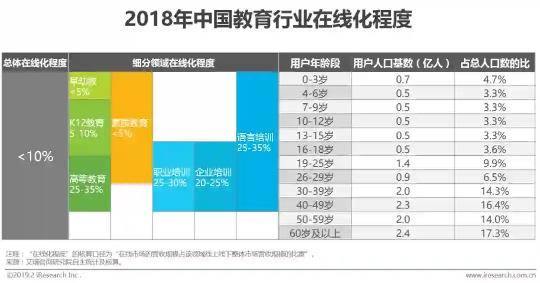 具体到教育行业各细分领域来看,成人教育市场的在线化程度更高,能到20-35%的水平,而18岁以下人群的教育市场的在线化程度较低,不超过10%。原因如上一页所述,成人对在线教育的接受度更高。
