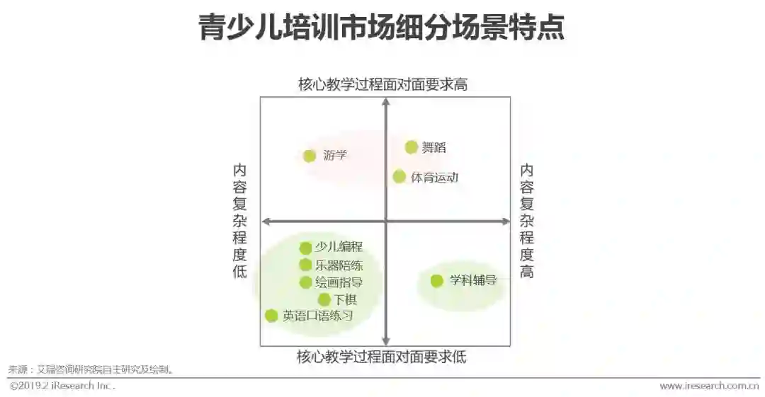 青少儿市场是在线教育渗透较慢的一个领域,主要包括K12学科辅导、K12素质教育、早幼教,这三个领域下又可细分出很多三级领域。其中,英语口语练习对师生面对面互动的要求最低(能实现语音传输即可),因此最先实现在线化;学科辅导、少儿编程、乐器陪练、绘画指导、下棋训练的师生面对面互动要求其次(除了语音传输外,还需要一定的图像传输),正在完成在线化;而游学、舞蹈、体育运动是面对面属性非常强的领域(需要肢体接触),其核心交付环节还没有开始线上化,这些领域开始线上化的技术前提是VR/AR的进一步发展。