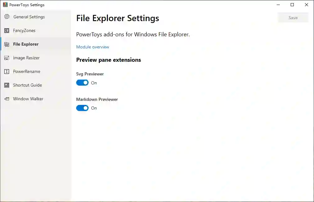 如果你也需要和这两种文件打交道,不妨在下载安装 PowerToys 0.16 后在应用设置中找到资源管理器设置(File Explorer),然后勾选 SVG Previewer 和 Markdown Previewer。至此我们便开启了 Windows 自带资源管理器的 SVG 图片和 Markdown 文件预览功能。