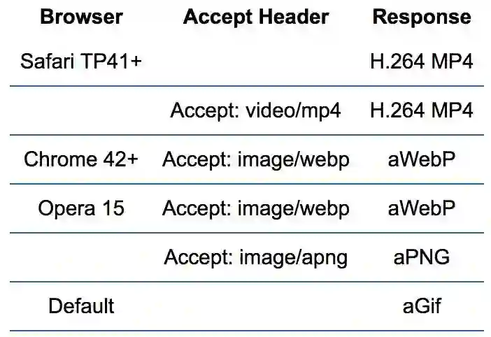 如果你不想改变 HTML 标记,你也可以使用 HTTP 将 MP4 附带内容协议发送给 Safari。要这么做,你需要基于 Accept 和 User-Agent 的 Header 生成动态图片(跟从前一样)和 Vary 回复的多个拷贝。