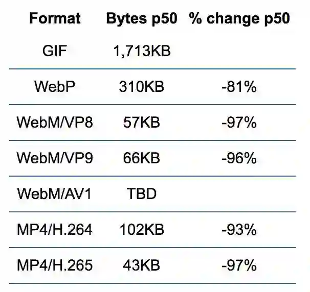 GIF 并不是唯一的具有动画小姑的图片格式。WebP 和 PNG 也都支持动画功能。但是,与 GIF 类似的是,他们都不是为动画设计的。这就导致,和专注于视频编码的格式如 H.264、H.265、VP9 和 AV1 相比,他们的动画文件体积巨大。