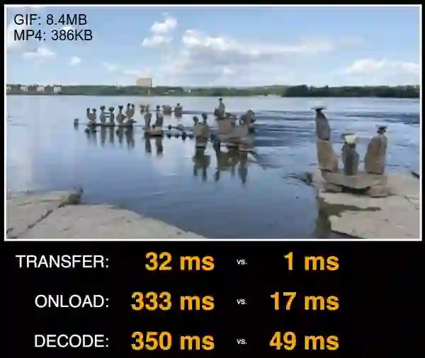 初步测试结果显示, <img> 标签中的 MP4 比同等条件下的 GIF 播放快 20 倍、解码快 7 倍——而文件尺寸仅为 1/14 !