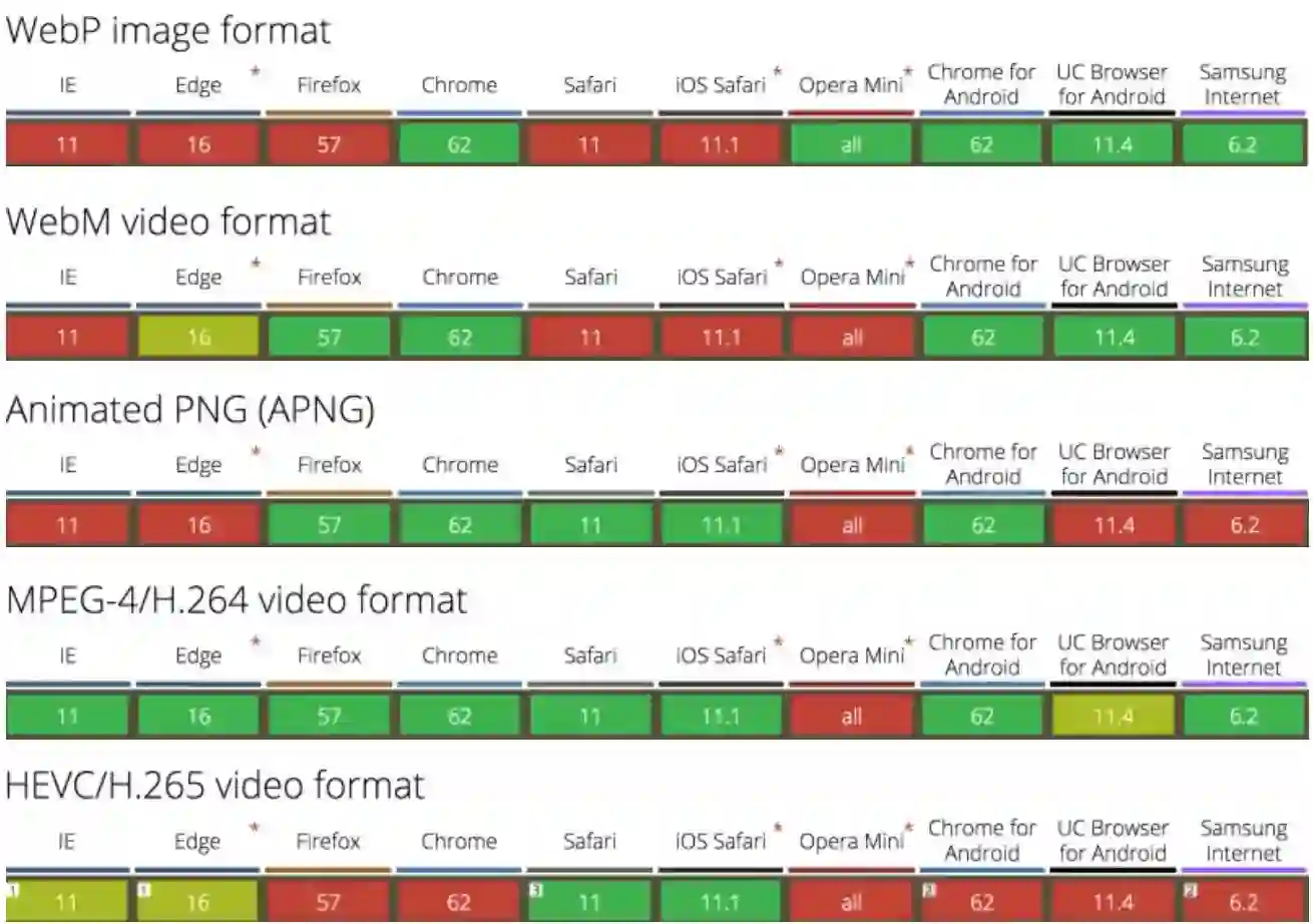 在 WebKit BUG 179178 发布后,这一切简单多了。你可以使用 Accept: video/* 进行测试(就像之前使用 Accept: image/webp 进行测试一样)。但是不同的浏览器有着不同的支持类型,具体如下