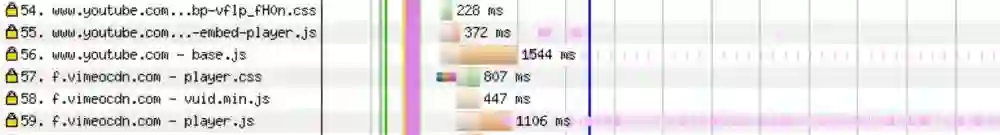 仔细看就能发现 JS 播放器在 DOM 完成之后立马请求了,但是很久之后才完全加载并开始播放视频。