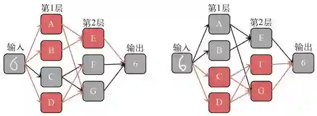 在图7 双层神经网络中,虽然输入是“6”的两幅不同形态的图像,但输出是一样的,并且该神经网络使用不同的神经元激活路径。尽管每一个神经元组合产生的预测是唯一的,但是每一个预测结果都可以由多个神经元组合实现。