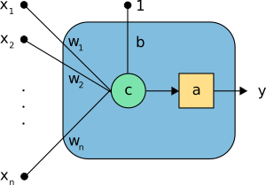 组合函数通过输入向量x生成组合值或净输入c。 感知机中,组合由偏移加上突触权重和输入的线性组合计算得到,