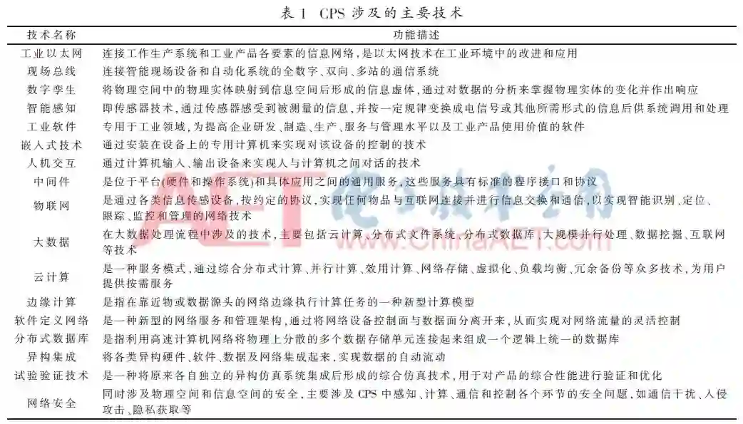 CPS的复杂性和多学科交叉性体现在其技术的广泛性和实现方式的综合性。通过对CPS组成结构和主要功能的分析,在表1中列出了CPS中涉及的一些主要技术[3]。