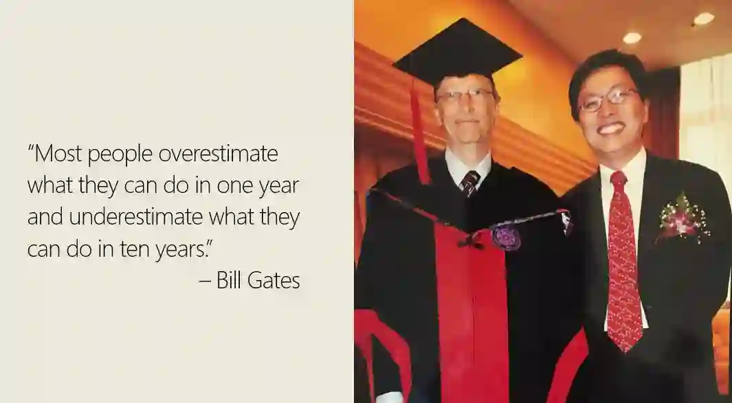最后,再回到我们的校友比尔·盖茨先生身上,其实我很喜欢跟盖茨一起工作的这段经历。我在微软的21年里经常和盖茨交流,我很喜欢他说的一句话,“大多数人都会高估一年能做什么,但是所有人都会低估十年能够做什么”。因为绝大多数的人都是线性的思维方式,但如果你真正找对了方向,做对了题目,你的成长实际上会是指数级的,所以我们一直以这样的方式来寻求发展、思考未来。