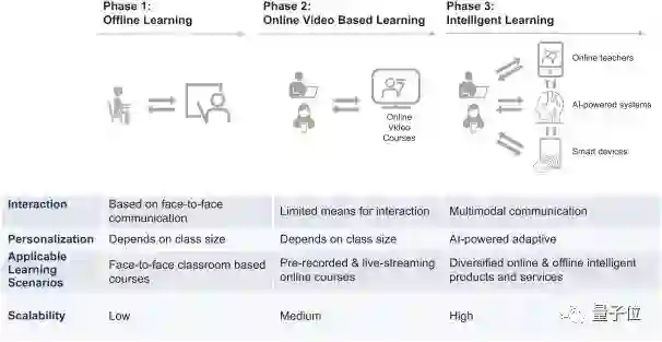 第三阶段,移动端普及、实时流媒体和AI技术地阿莱变革,高互动、自适应学习体验成为可能,各种在线应用和AI技术可以应用到各个学习场景中,在教与学两侧都能发挥作用。