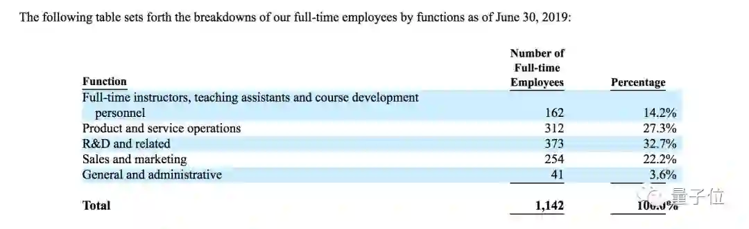 另一方面,在当前总员工1142人中,运营相关的专职讲师、助教和课程开发人员162人,产品和服务运营312人,运营相关的两部分总占比41.5%。