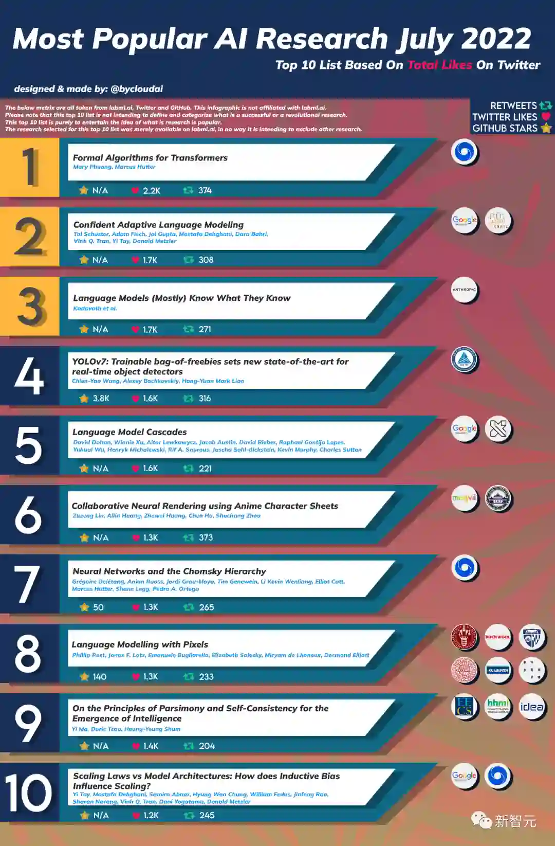 这份由Reddit网友@bycloudai整理的榜单,根据推特点赞、转发和Github星数排序,列入了2022年七月排名前十的AI研究,其中包括DeepMind、Google、MIT CSAIL等知名机构。