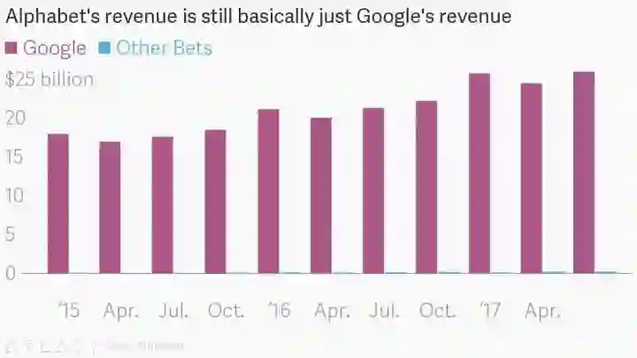 Alphabet 的 2016 年年报显示,Other Bets 业务板块的收入虽然在 2015 年仅为 4.45 亿美元,但在 2016 年一斤上升至 8.09 亿美元,增长了 3.64 亿美元。不过,这些收入在当年 Alphabet 总营收中的占比还不 1%。
