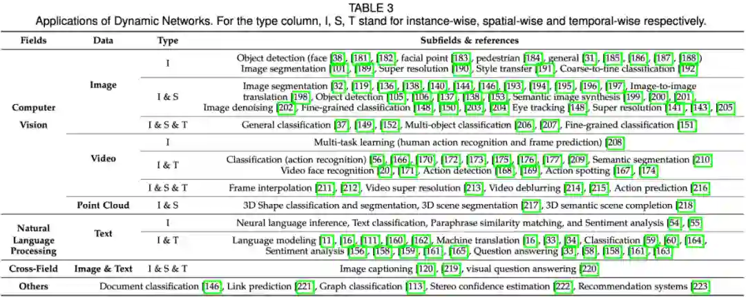 根据输入模态,研究者总结了动态网络在领域中的应用情况以及相对应的自适应推理类型,如下表所示: