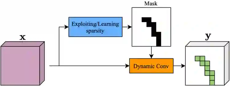 2. 鼓励稀疏度。对于具有动态结构或者进行空间 / 时间位置采样的模型,如果不添加额外的约束项,一个可能的结果是网络为了极小化训练误差,倾向于激活其所有的模块 / 采样所有的位置进行计算。因此,为了减少冗余计算,此类网络通常需要添加一项正则项以鼓励稀疏度。从而,整体的训练目标可以写为。该正则项可以是候选单元的激活比率或范数[56],也可以是由输入输出的数据维度估算的模型计算量[43];