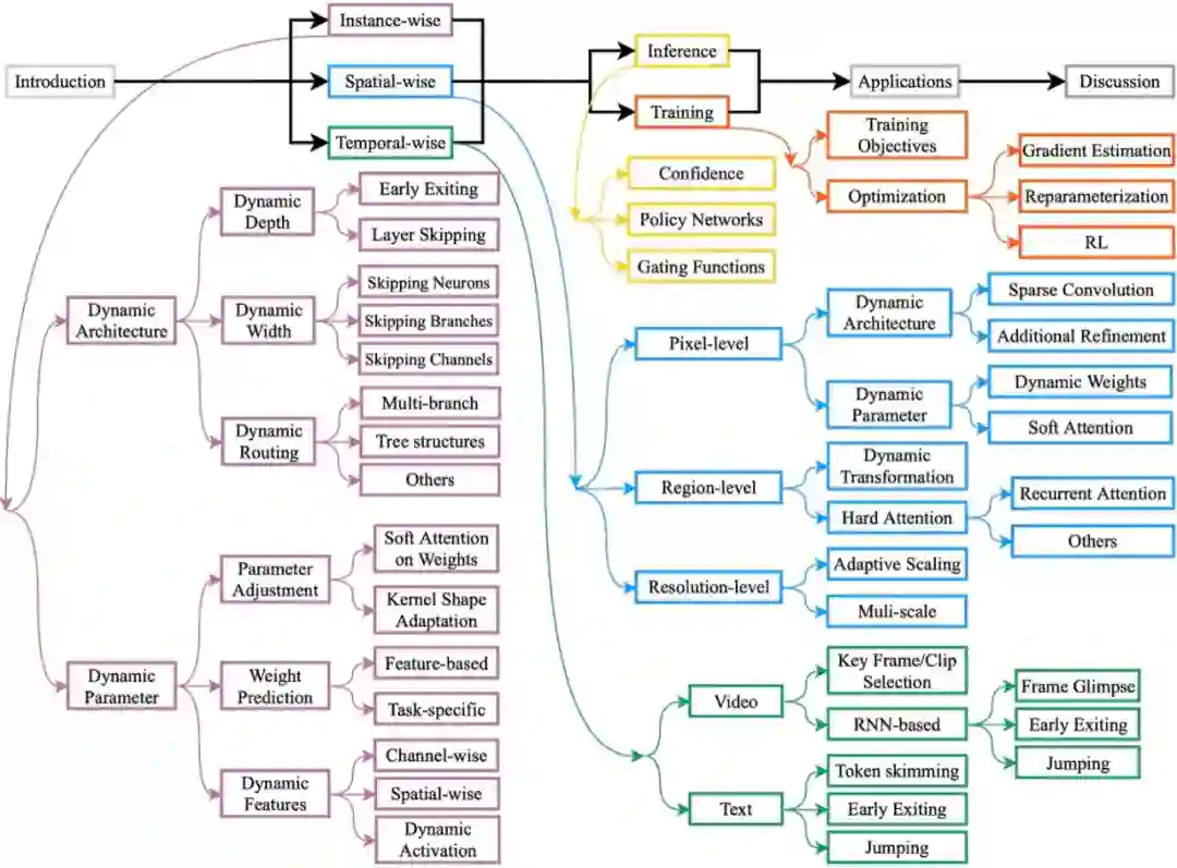 动态网络:模型能够针对不同输入样本,自适应地调节其结构或参数。第 3、4 章中分别介绍了两种更细粒度的动态模型: