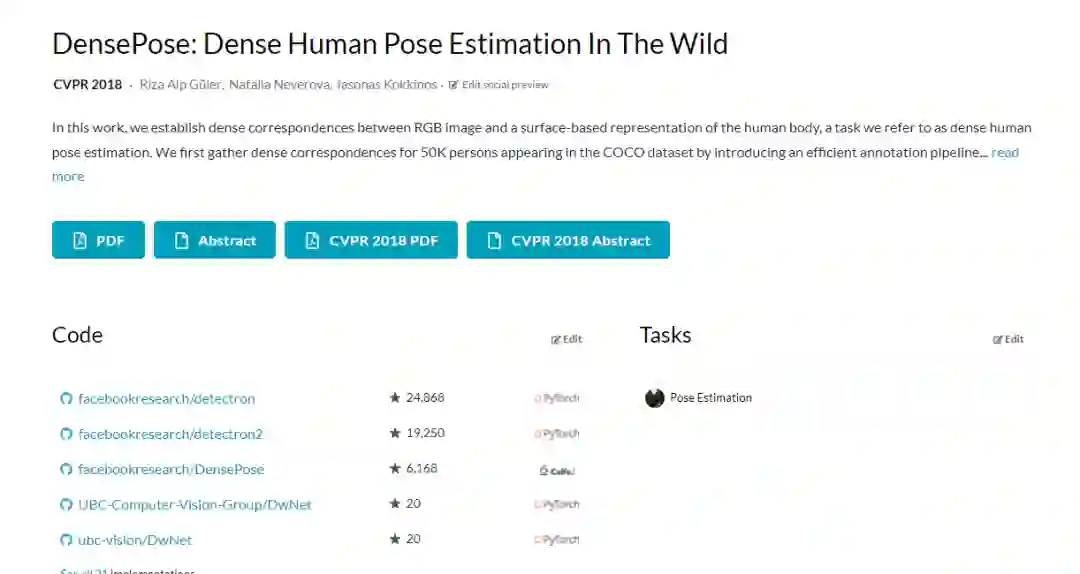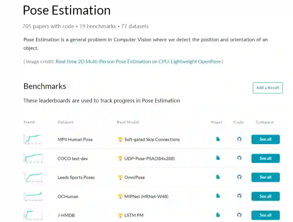 在网站中搜索Pose Estimation后,就会把相关的数据集、性能最佳的模型等列出来。