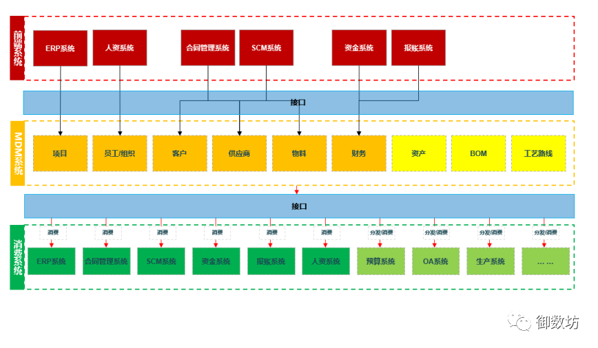 主数据分布于各个系统中,在此可将主数据分布的系统分为两大类:前端系统与消费系统。前端系统是主数据生成的系统,而消费系统则是主数据使用系统。主数据管理平台便是连接前端系统与消费系统的桥梁。所有系统间的对接需要通过接口进行集成,SOA、Webservice、DBlink、API等系统对接方式可供选择。