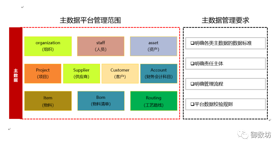 确定主数据平台管理范围是进行平台构建的第一步。企业包括多种主数据,比如项目、供应商、客户、物料、员工组织、COA等等,首先确定哪些主数据需要纳入平台进行管控。