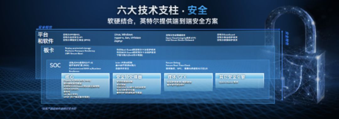 在安全方案方面,英特尔一方面是使用自家硬件层级来制作出完整的安全技术方案,另一方面则是和产业界一起合作从而产出解决方案。