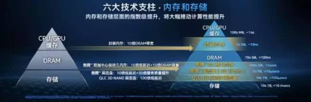 具体来说就是:封装内存插在缓存和DRAM之间,DRAM和存储之间插入三层:数据中心级的持久内存、还有固态盘、和QLC固态盘。