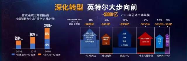 2018年,英特尔营收总额为708亿美元,以数据为中心的业务占比高达48%。