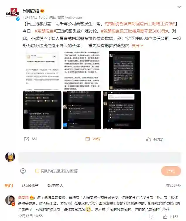 发帖员工还透露,这次员工的抱怨还引发了公司内部“大战”,群里已经吵翻了!一组茶颜悦色公司全员群里的聊天记录,瞬间在网上疯传。