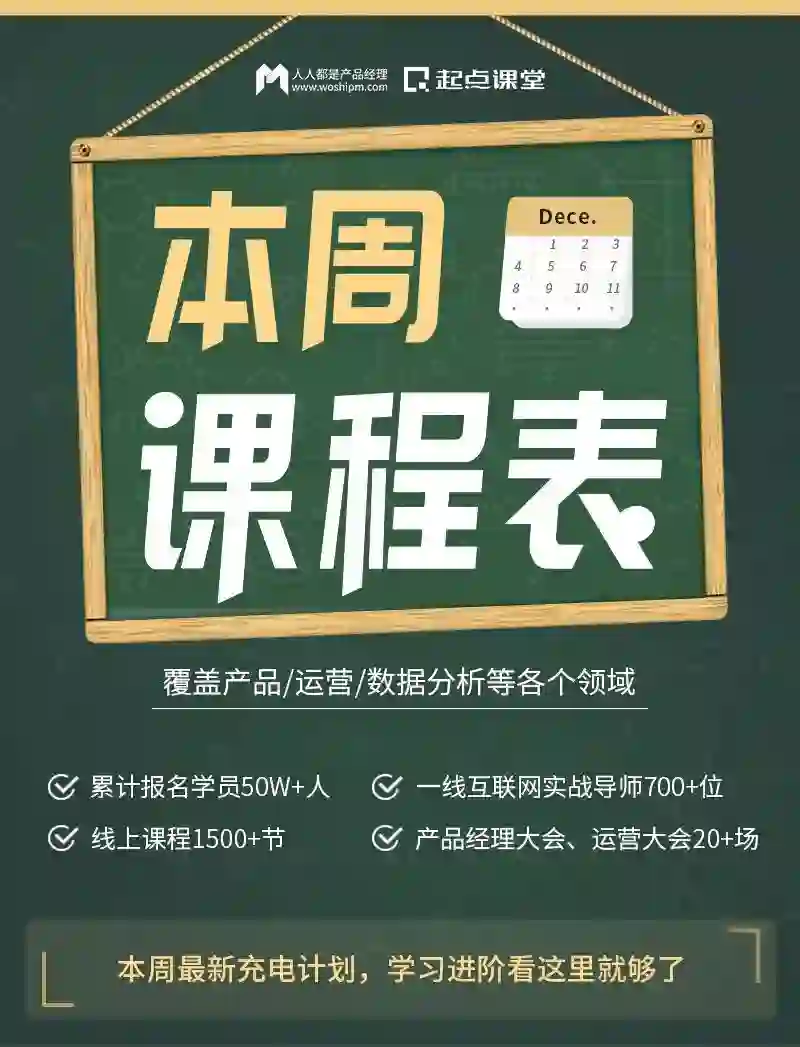 为了让大家更有底气的应对未知风险,起点课堂联合一线大厂实战导师,打造了产品/运营/数据分析等一系列体系课以及专项突破课,帮助大家从入门到进阶,持续实战-复盘-输出,提高自身竞争力~
