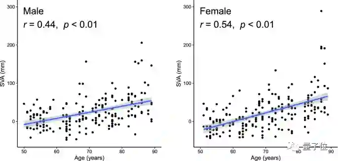 首先研究人员得出了年龄与SVA之间的关系,即无论男女,随着年龄的增长,其驼背程度会越来越严重。
