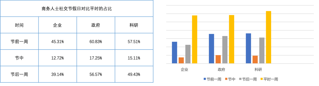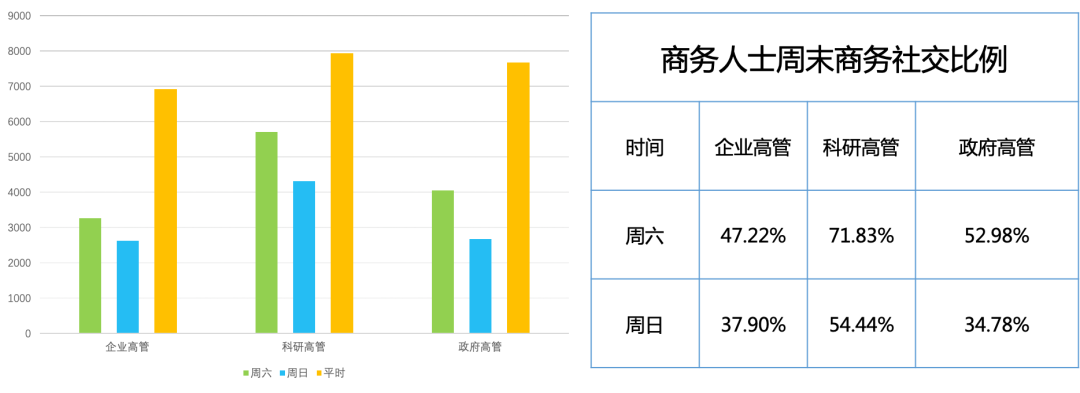 相比科研、政府机构,企业高管们则更加重视自己的私人时间,无论是在周六日还是节假日,他们的商务社交活动都明显减少。