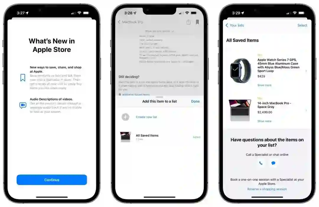 近日,iOS版的Apple Store应用更新了一些新功能,你可以将心仪商品收藏到清单。到店与 Specialist 专家分享清单,相关的交流内容会发送至 app 供你回顾,方便你选好商品后轻松购买。一旦你与Specialist 就清单进行了会面,你将能够在新的摘要部分看到有关该清单的注释和建议。更新还带来了口述影像功能,聆听视频来了解产品的全部详情。