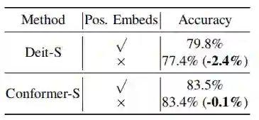 当去除Positional Embedding时,DeiT-S的精度降低了2.4%,而Conformer-S的精度略有下降。