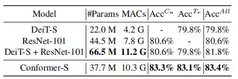 如上图所示,CNN支路、Transformer支路、Conformer-S的精度分别达到83.3%、83.1%和83.4%。而CNN和Transformer集成模型的精度也只有81.8%。