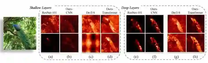 最近Transformer结构被用到了视觉任务中,ViT方法通过将每个图像分割为具有位置嵌入的Patch来构建一系列token,然后用Transformer Block来提取参数化向量作为视觉表示。由于自注意力机制(Self-Attention)和多层感知机(MLP)结构,Vision Transformer能够反映了复杂的空间变换和长距离特征依赖性,从而获得全局特征表示。然而,Vision Transformer会忽略了局部特征细节,这降低了背景和前景之间的可辨别性(如上图(c)和(g)所示)。因此,一些工作提出了一个tokenization模块或利用CNN特征图作为输入token来捕获特征的邻近信息。然而,这些方法依旧没有从根本上解决好局部建模和全局建模之间的关系。