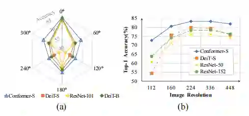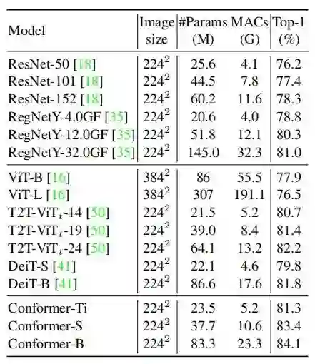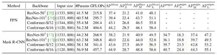 作者通过实验证明,在相似的参数和复杂度下,Conformer在ImageNet上比DeiT-B好2.3%。在MS-COCO数据集上,它在目标检测和实例分割任务上,分别比ResNet-101高出3.7%和3.6%的mAP。